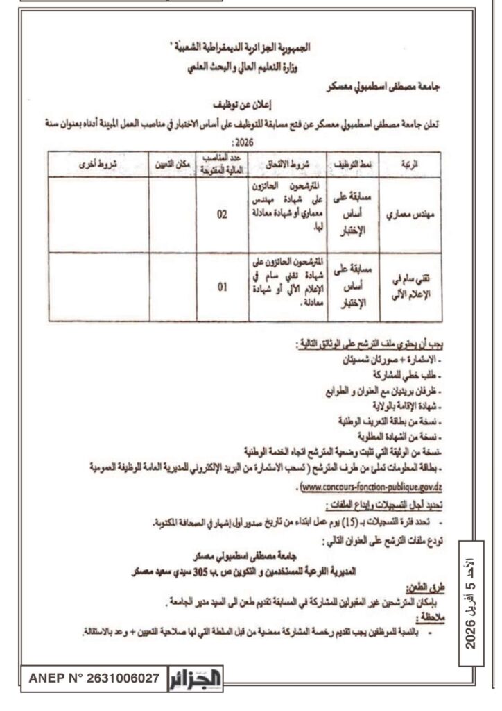 تعلن جامعة مصطفى اسطمبولي معسكر عن فتح مسابقة على أساس الإختبار بعنوان سنة 2026
