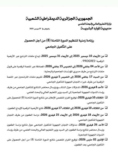 الاعلان عن افتتاح الدورة الثامنة للحصول على التأهيل الجامعي مرفوقا بالجدول الزمني المنظم للدورة ابتداءا من 10 ديسمبر 2025 إلى 31 ديسمبر 2025