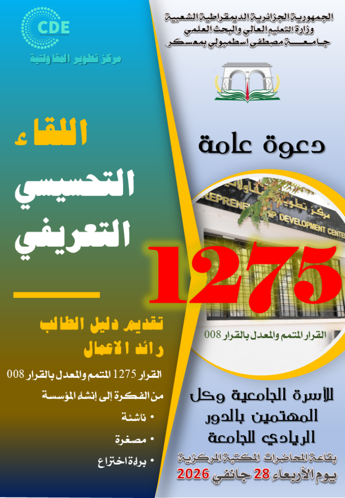 يُعلن مركز تطوير المقاولاتية عن تنظيم لقاء تحسيسي حول القرار رقم 1275، المتمم والمعدل بالقرار رقم 008، والمتعلق بمسار «من الفكرة إلى إنشاء المؤسسة»، وذلك يوم الأربعاء 28 جانفي 2026 بقاعة المحاضرات بالمكتبة المركزية للجامعة.